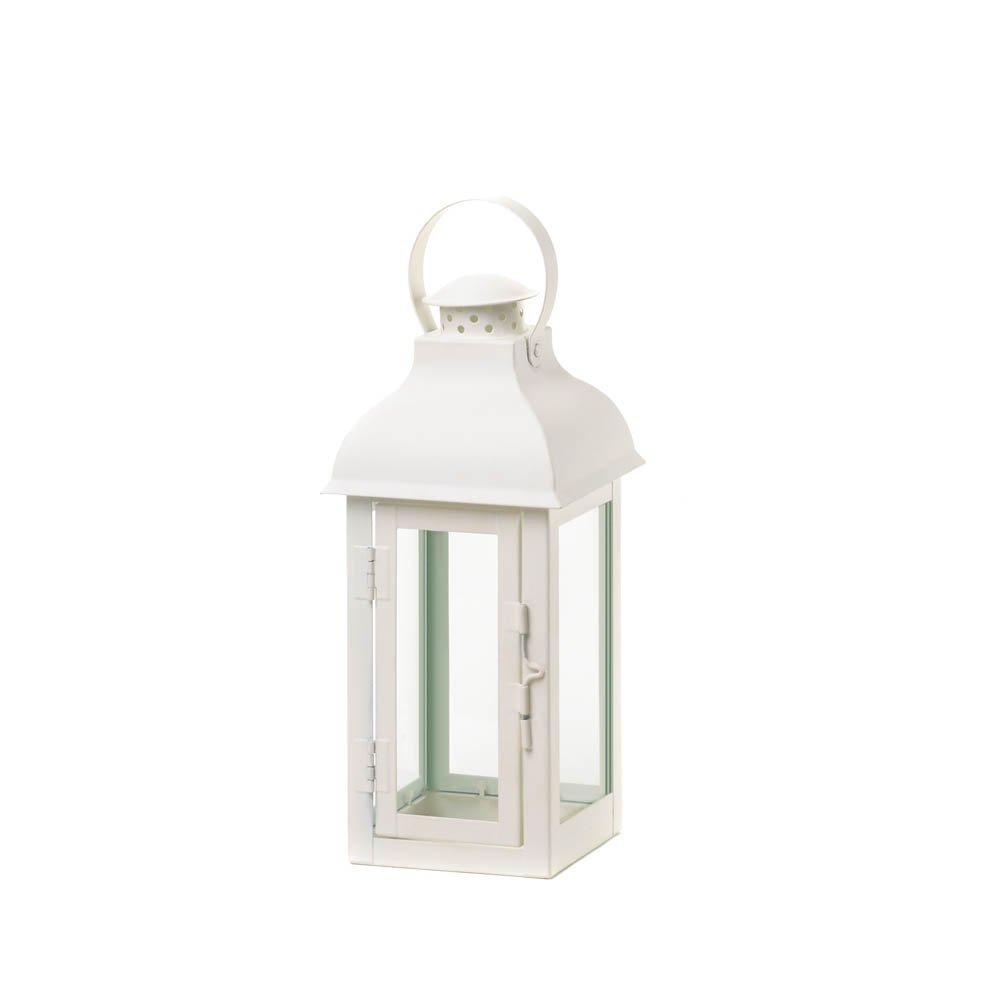 • With elegant simplicity, this metal candle lantern strikes the right chord to create a sophisticated and welcoming atmosphere. The metal framework features soft white paint and a domed roof with a wide loop at top. Clear glass panels let the light of your favorite candle shine through.