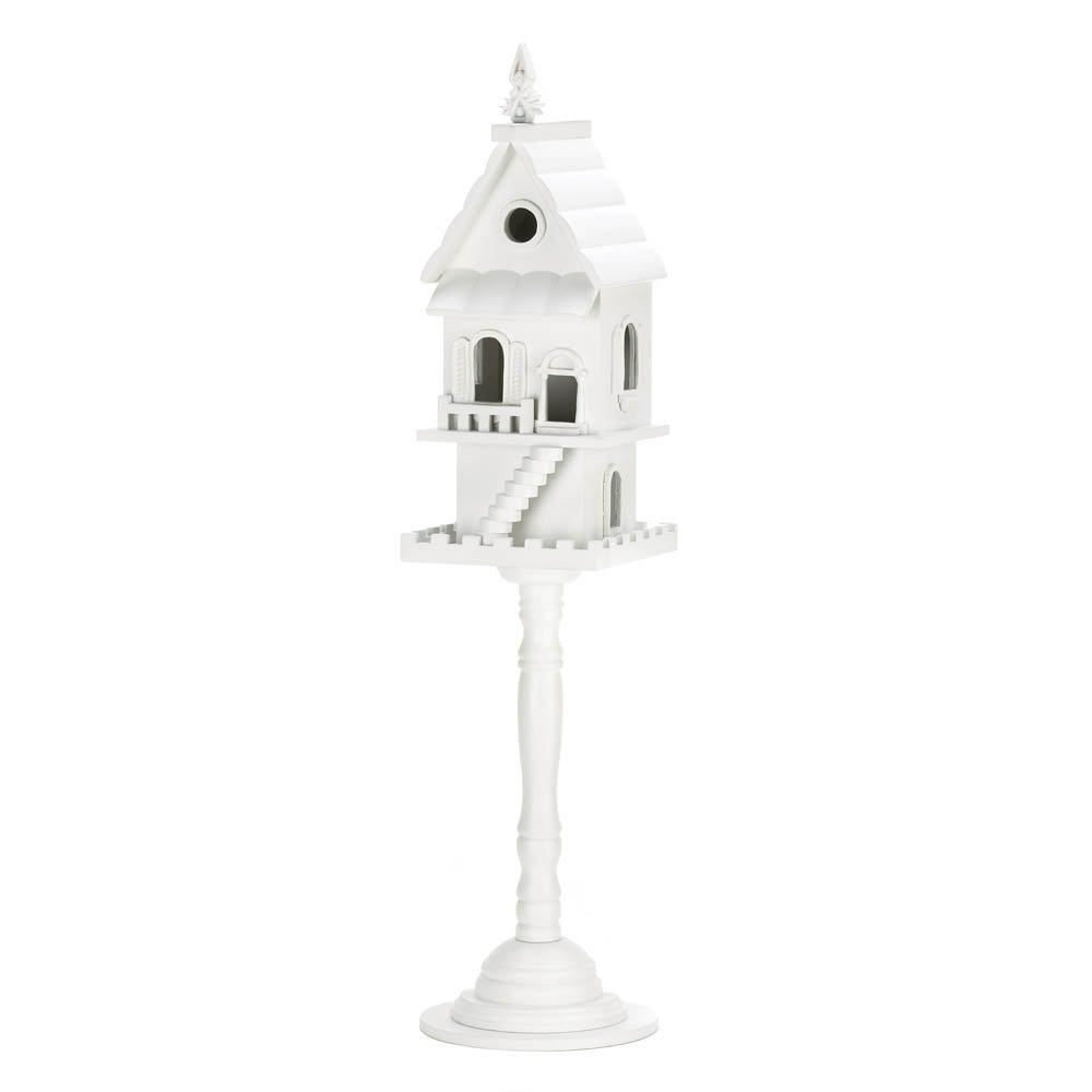 • Give the birds a grand home to call their own with this gorgeous white birdhouse. Its charming features include a front staircase, multiple entrances, two separate floors, a turned pedestal stand, and top decorative finial.