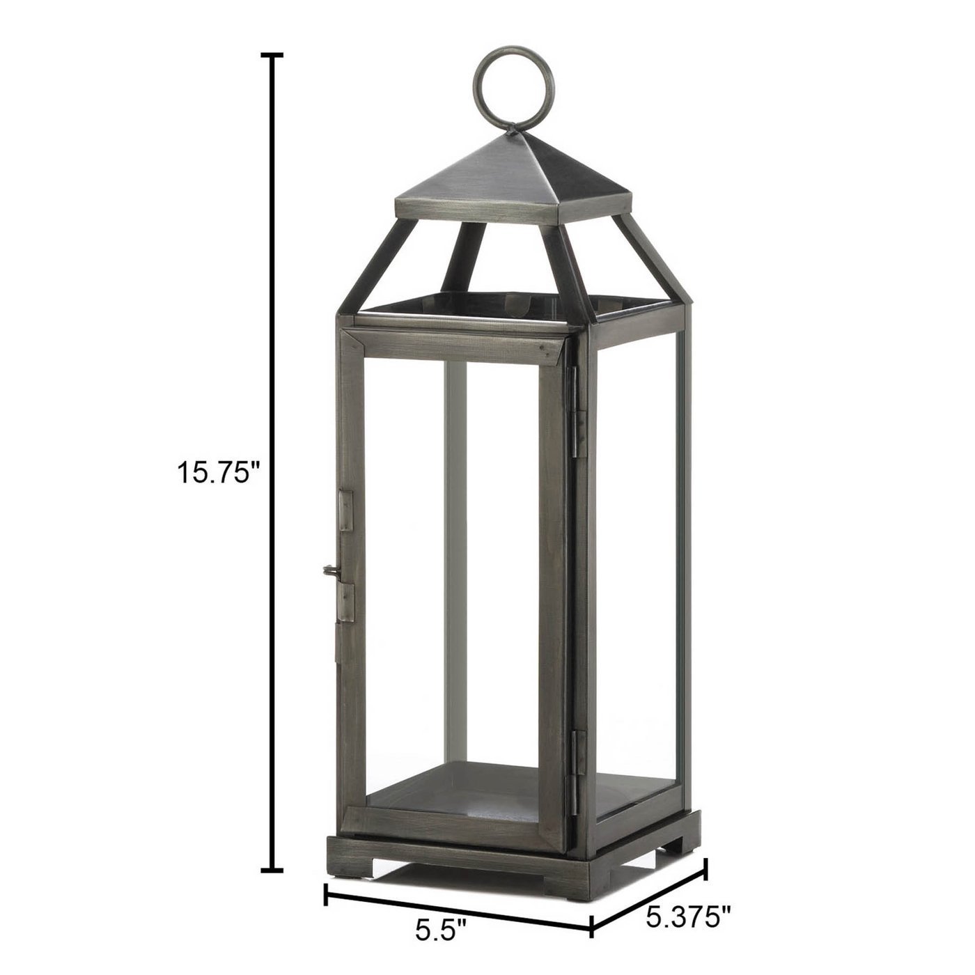 • Unique and eye-catching, this metal pewter lantern will add intrigue to your outdoor or indoor décor. This lantern features a durable iron frame with a brushed pewter finish, encased with glass window panes. Place a pillar candle inside the metal lantern to bask any room in a soothing warm glow.