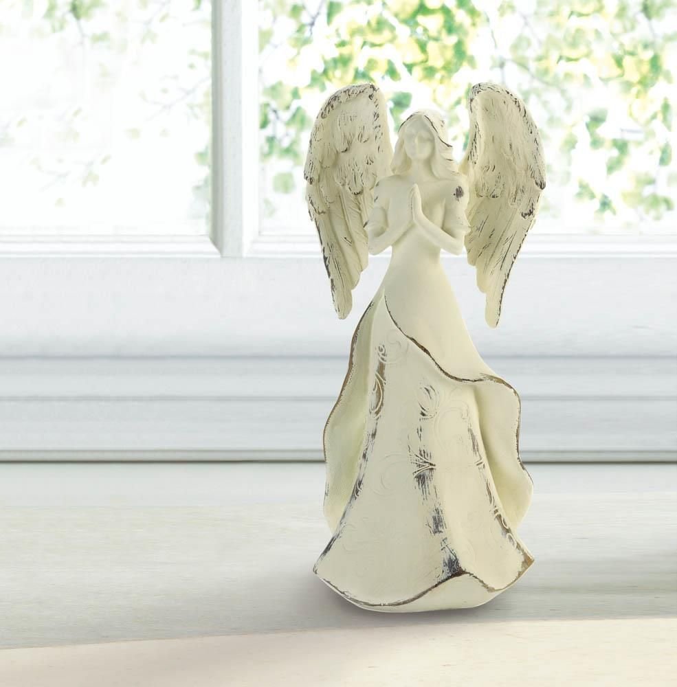 May you find the strength to carry on. This angel brings serenity to your home and is a beautiful accent piece all year long. The distressed ivory finish reminds us of the French countryside and the simple life. She makes a lovely hostess gift, or a wonderful gift for anyone. Weight 0.8 pounds. 4" x 3" x 8.5". Polyresin. UPC Number: 849179039783.